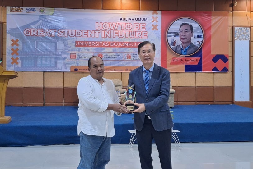 BOJONEGORO — Prof. Dr. Kim Soo-il, mantan duta besar Korea Selatan untuk Indonesia, menjadi dosen tamu di Universitas Bojonegoro (Unigoro), pada Rabu (13/12/23). Pria yang menjabat sebagai founder Busan Indonesia Center ini hadir sebagai pemateri dalam kuliah umum yang bertajuk How To Be Great Student In Future.